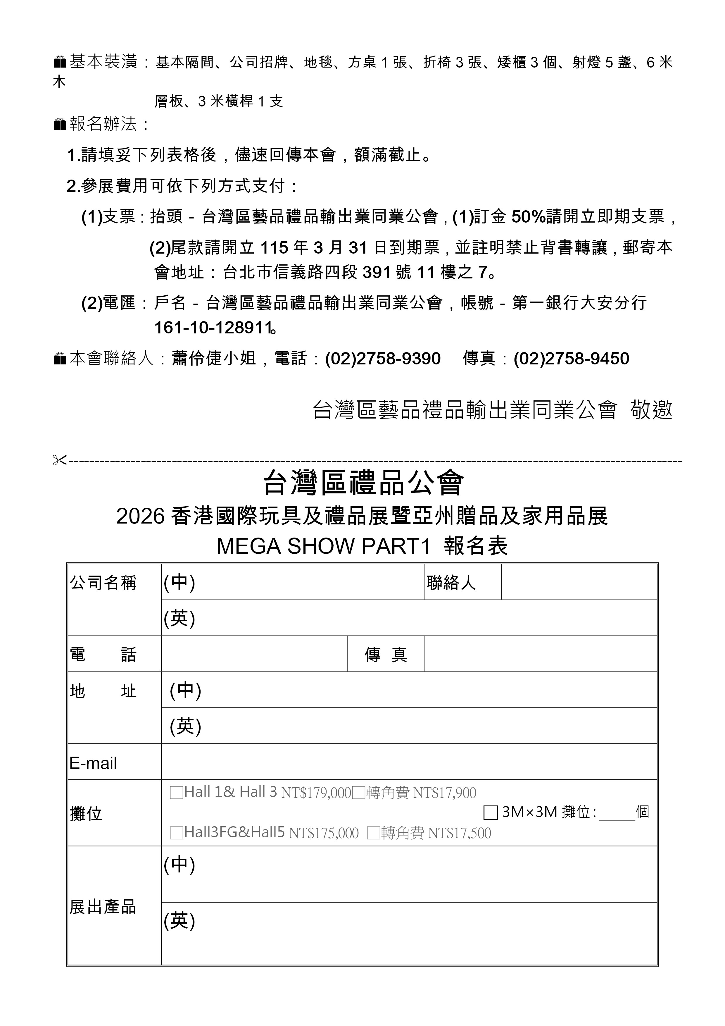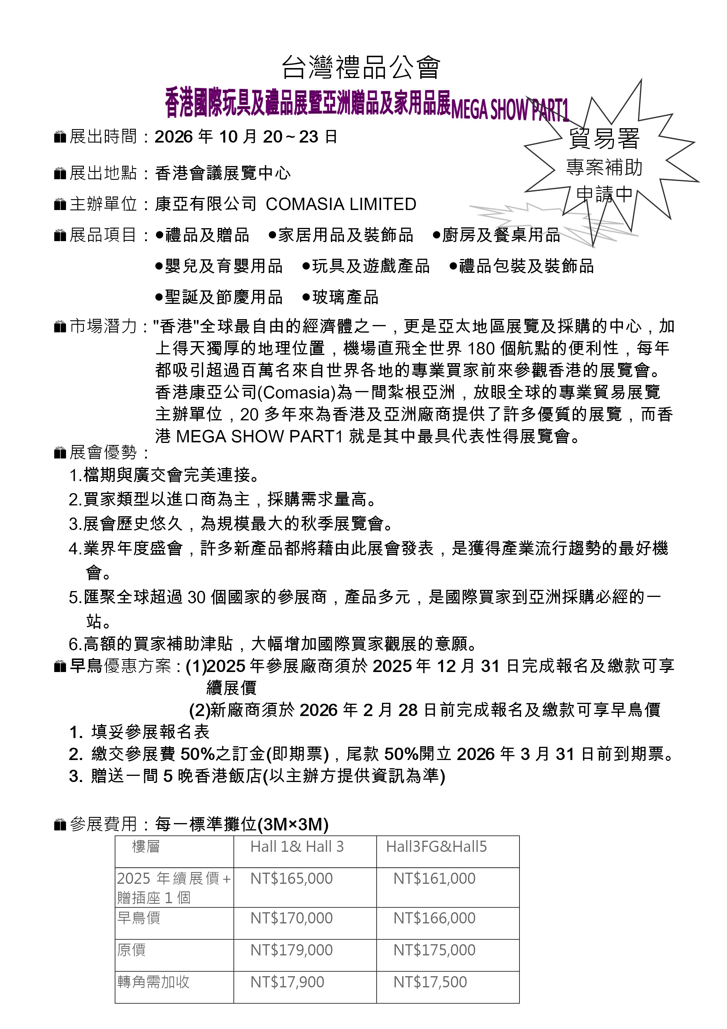 2026 香港國際玩具及禮品展暨亞洲贈品及家用品展 MEGA SHOW 10/20-23 - 徵展