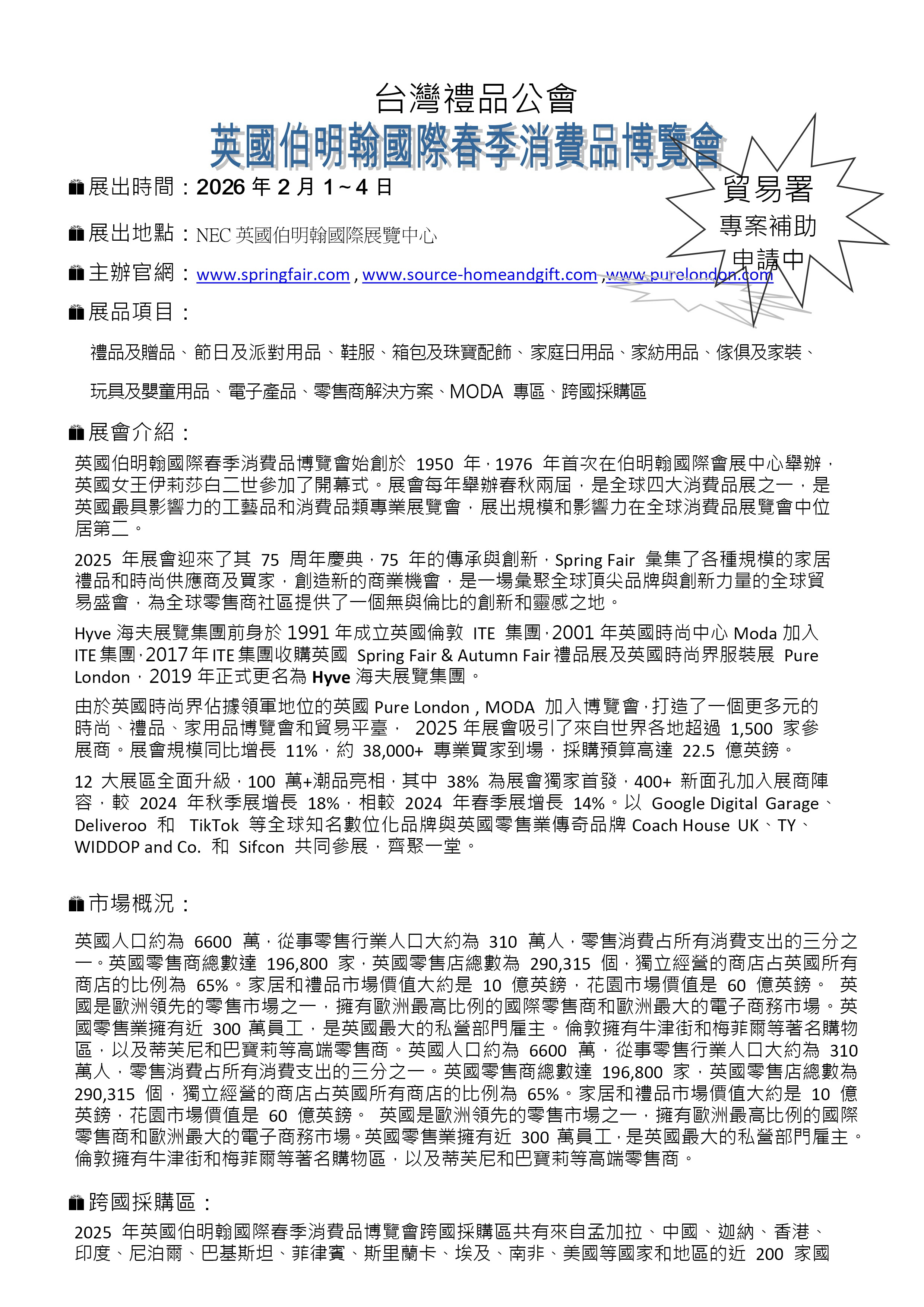 | 名 称: | 2026 英国伯明翰国际春季消费品博览会 2/1-4 - 徵展 | ||