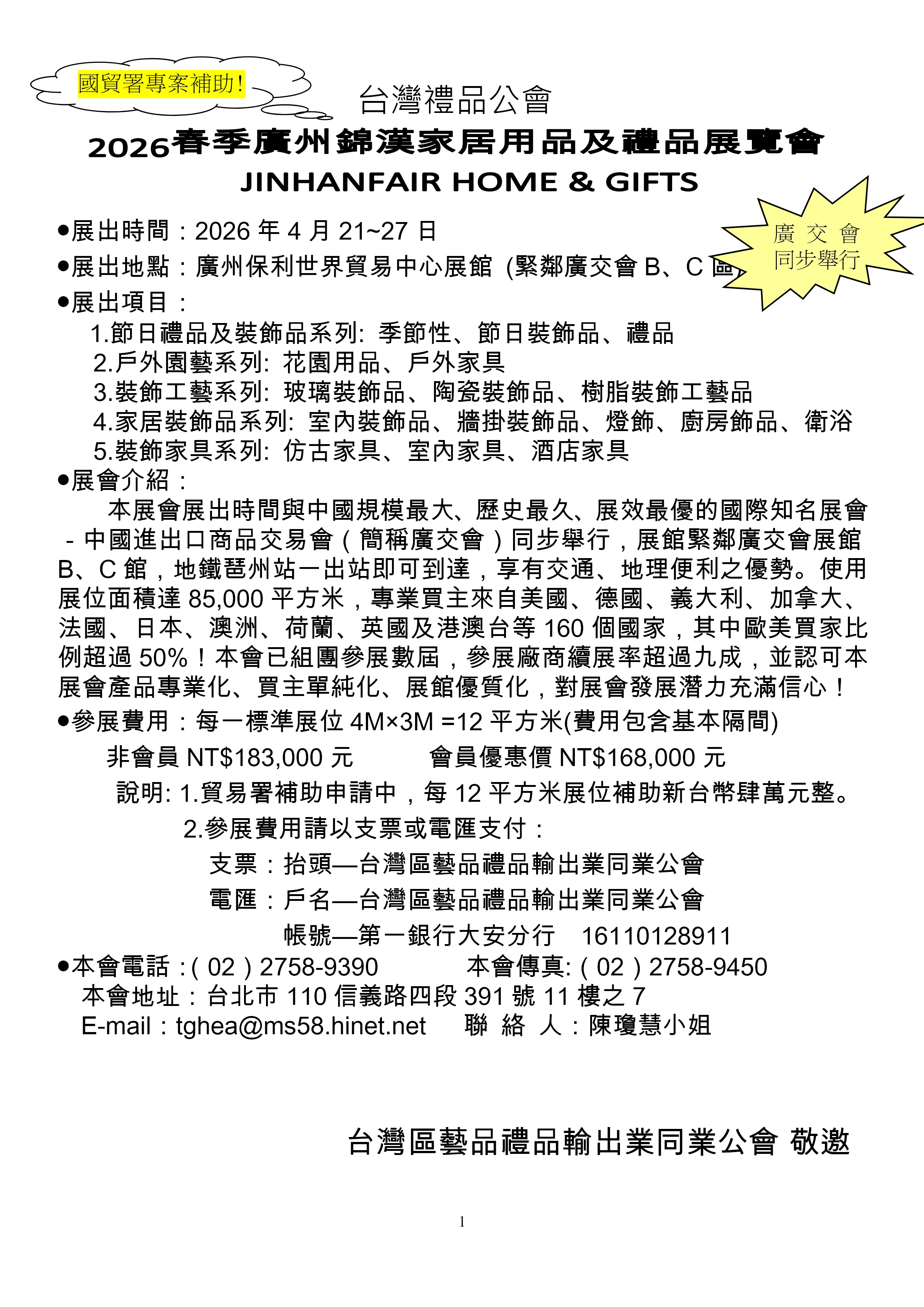 | Organ: | POLY EXHIBITION | Group: | TAIWAN GIFT & HOUSEWARE EXPORTERS ASSOCIATION |