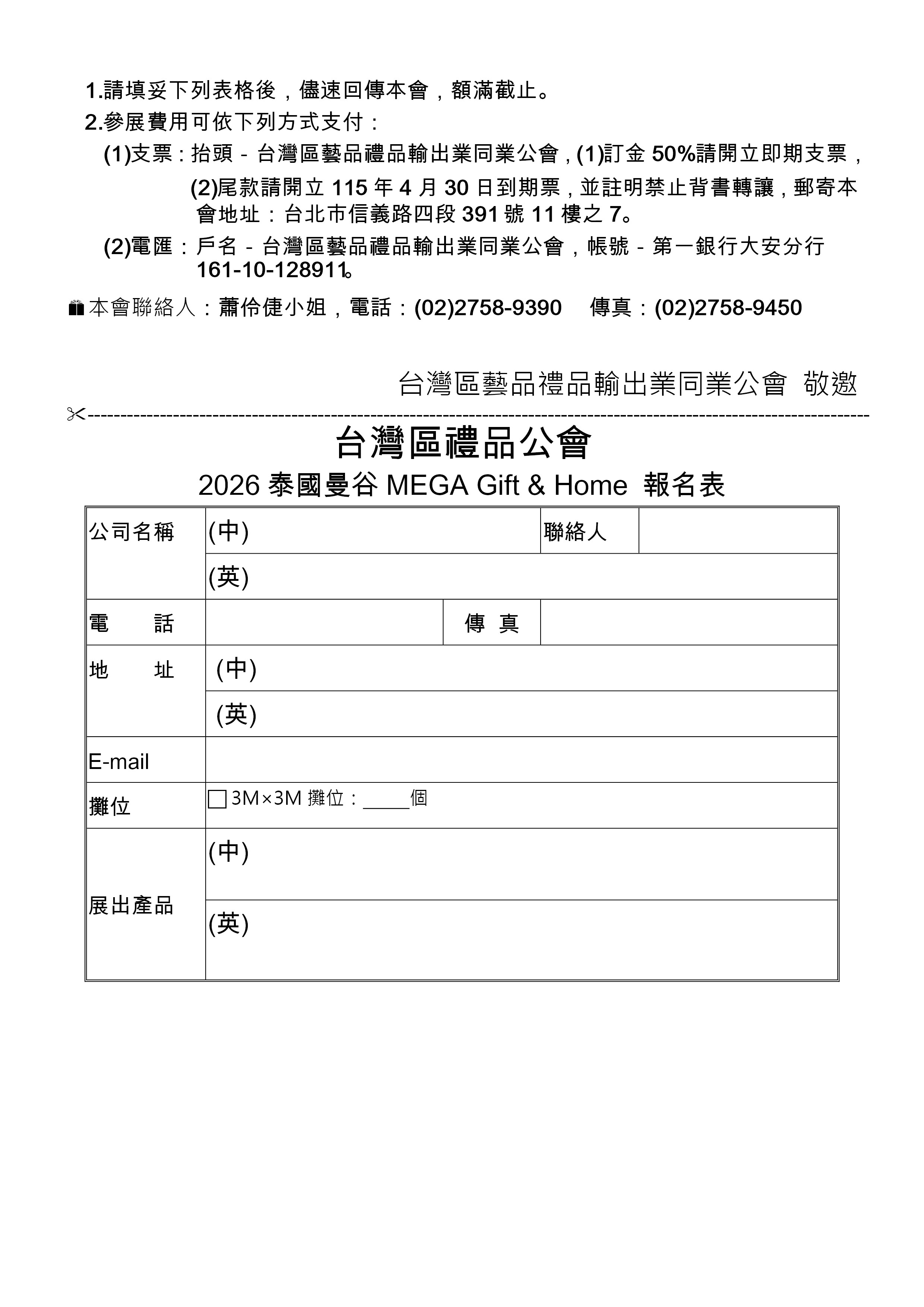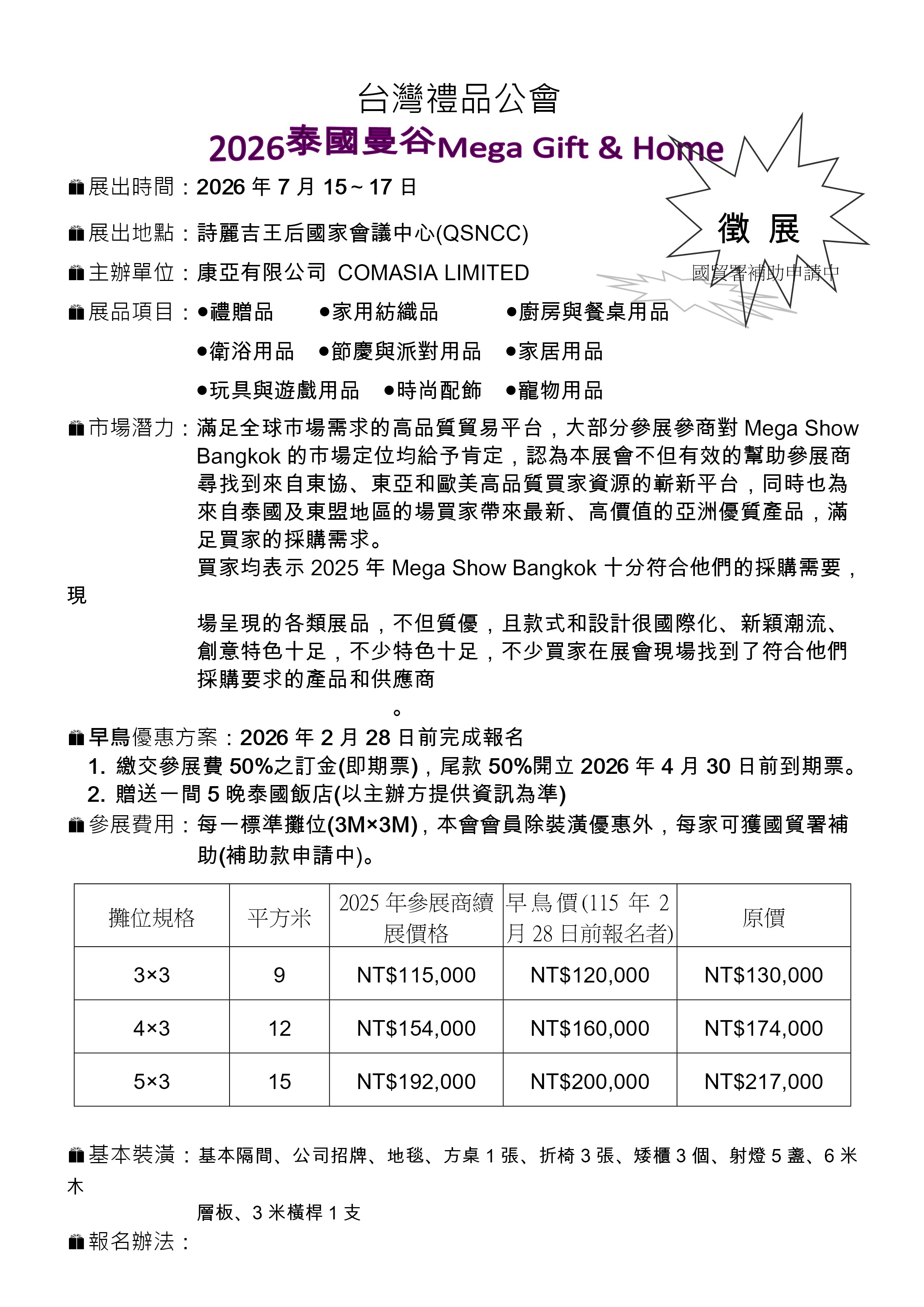 | Organ: | COMASIA LIMITED | Group: | TAIWAN GIFT & HOUSEWARE EXPORTERS ASSOCIATION |